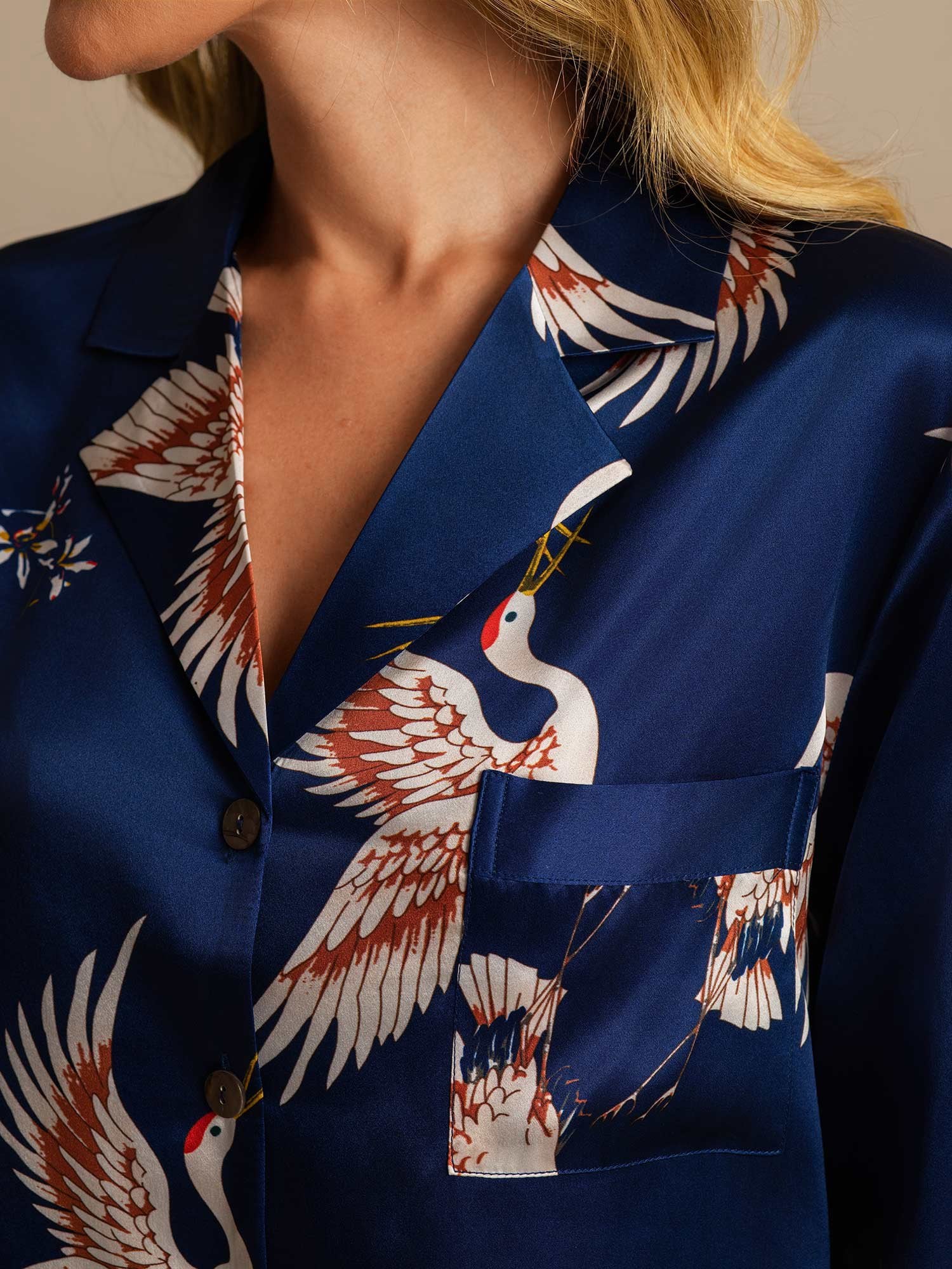 19Momme Pure Silk Crane Print Nattlinne med High-Low Söm