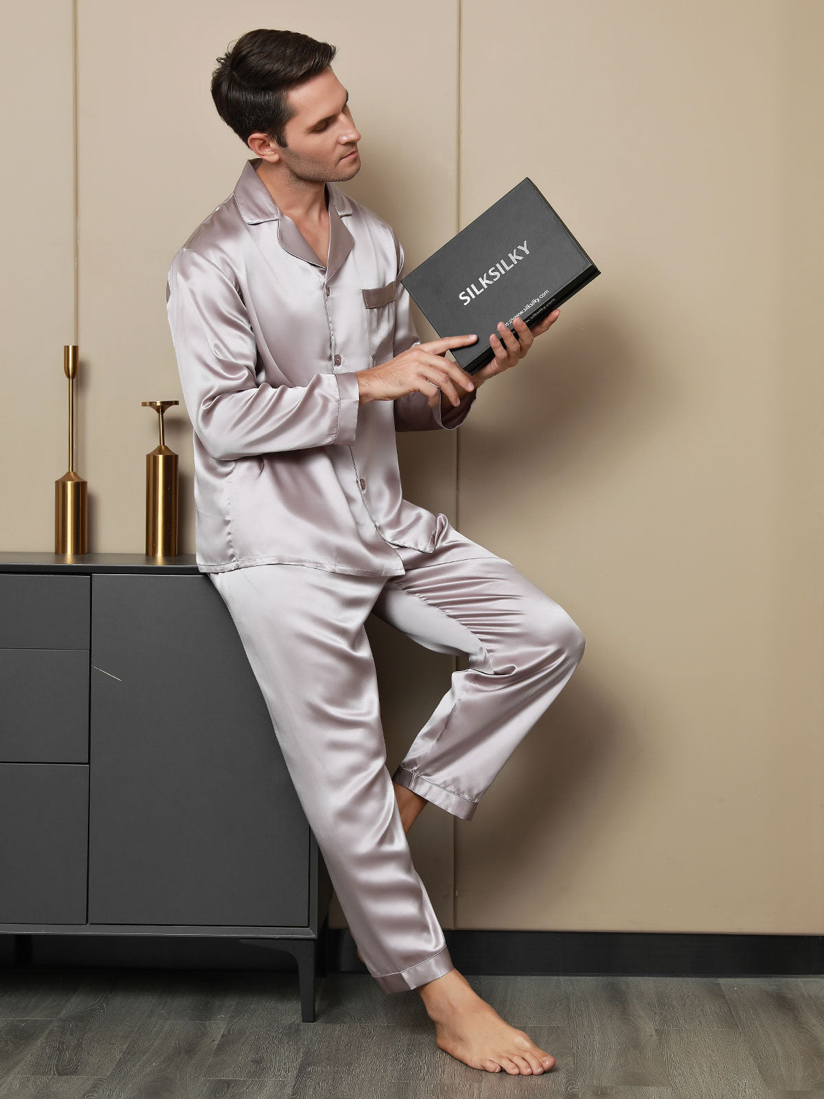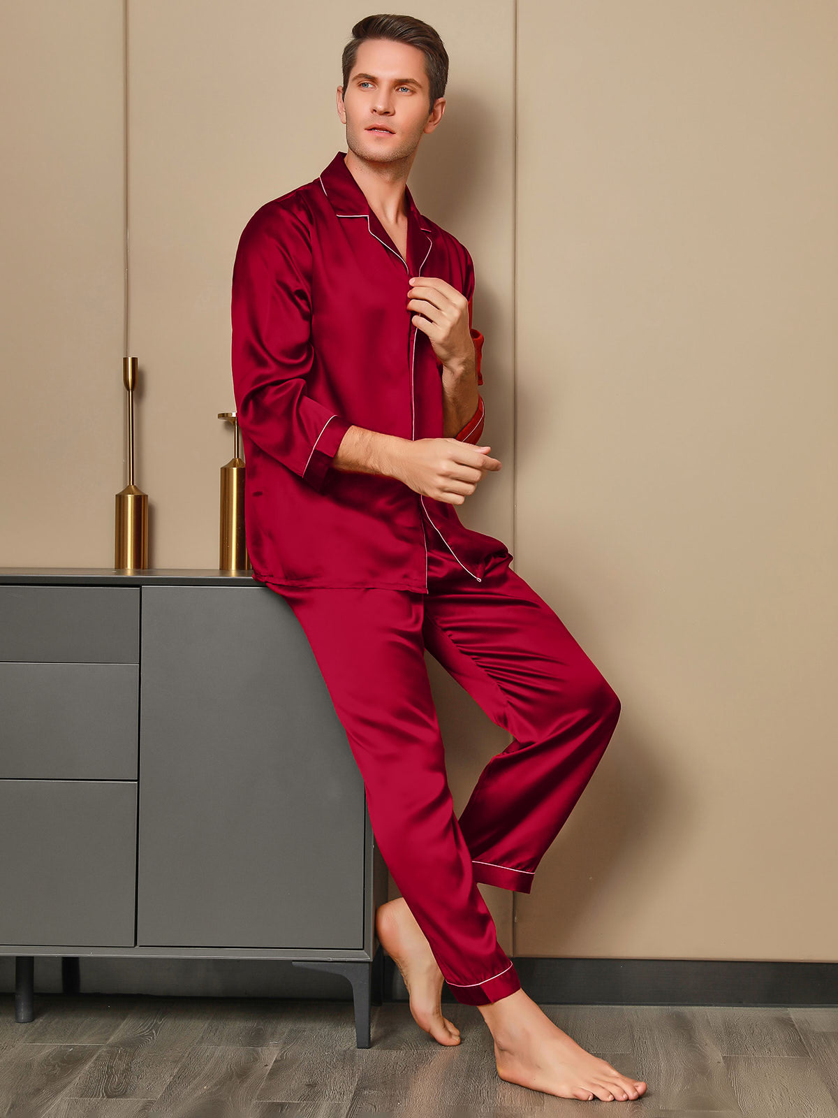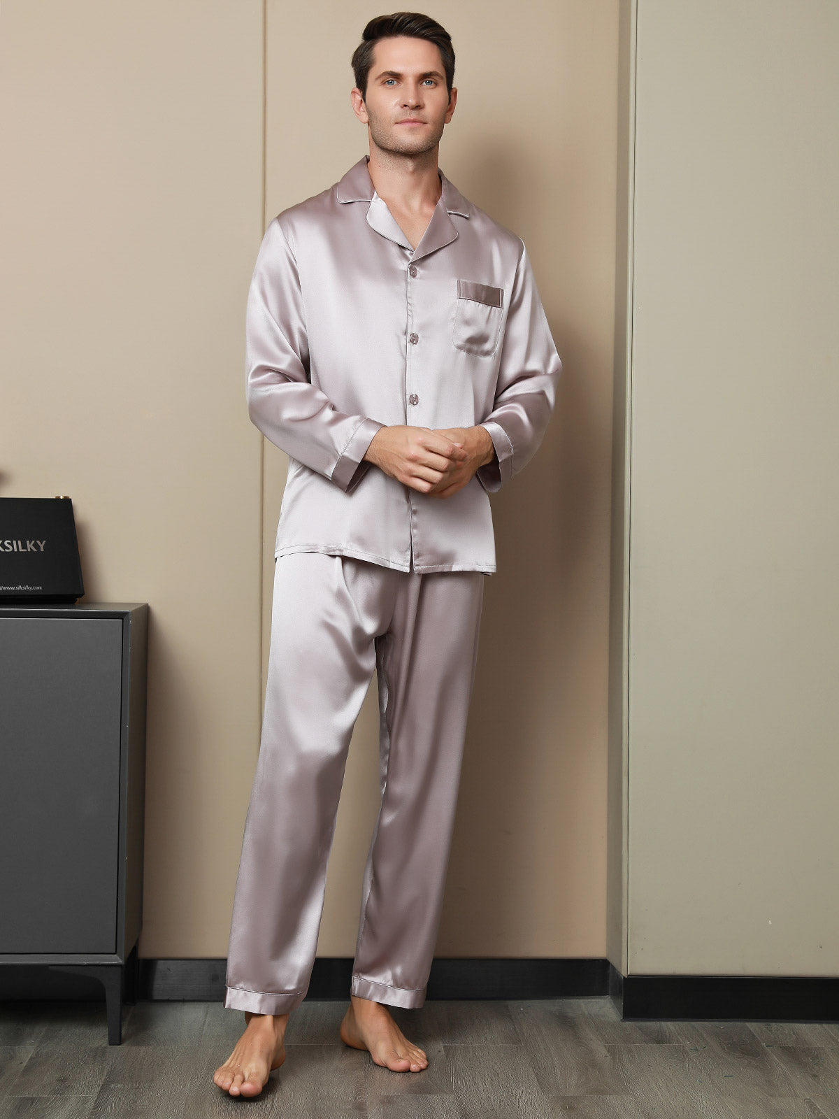 Herrpyjamas I Ren Siden Med Lång Ärm Notchkrage Och Knäppning