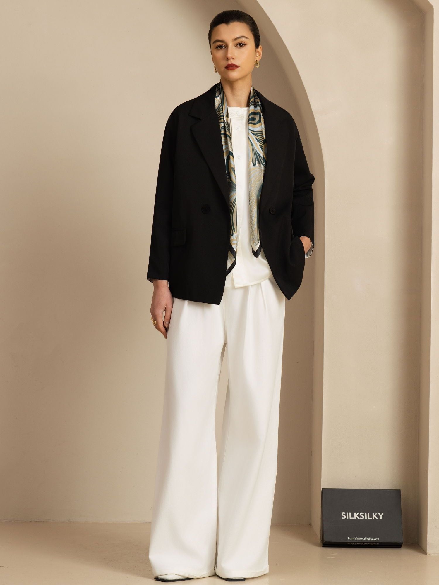 Denna scarf i ren silke har ett slående abstrakt blommönster, med flödande solfjäderformade linjer som skapar en dynamisk och konstnärlig estetik. Djupgrönt, guld, beige och mjukblått samverkar till en sofistikerad färgkombination, vilket ger scarfen en modern men lyxig känsla. Det lager-på-lager, dynamiska mönstret gör scarfen till ett bärbart konstverk som tillför personlighet till varje outfit. En mörk kant markerar mönstret subtilt och framhäver designen. Denna mångsidiga scarf kan bäras runt halsen, som huvudduk, sjal eller knuten på en handväska, och passar både vardag och fest.