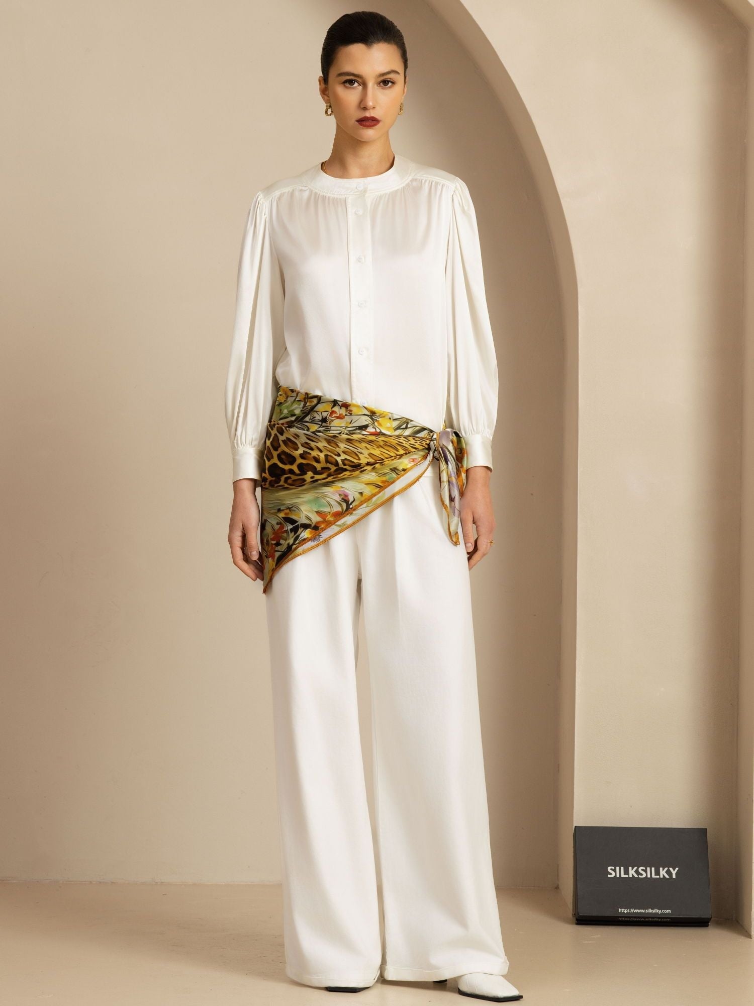 Mäter 90x90 cm och är denna scarf tillverkad av premium siden, vilket ger en slät och lyxig känsla. Den livfulla färgblockdesignen ger en djärv och iögonfallande stil, medan den mångsidiga storleken gör att den kan bäras som halsduk, pannband eller accessoar på väska. Genom att kombinera vilda leopardmönster med blommig konstdesign utstrålar denna sidenscarf självförtroende och förmedlar utan ansträngning en känsla av sofistikering och feminin styrka.