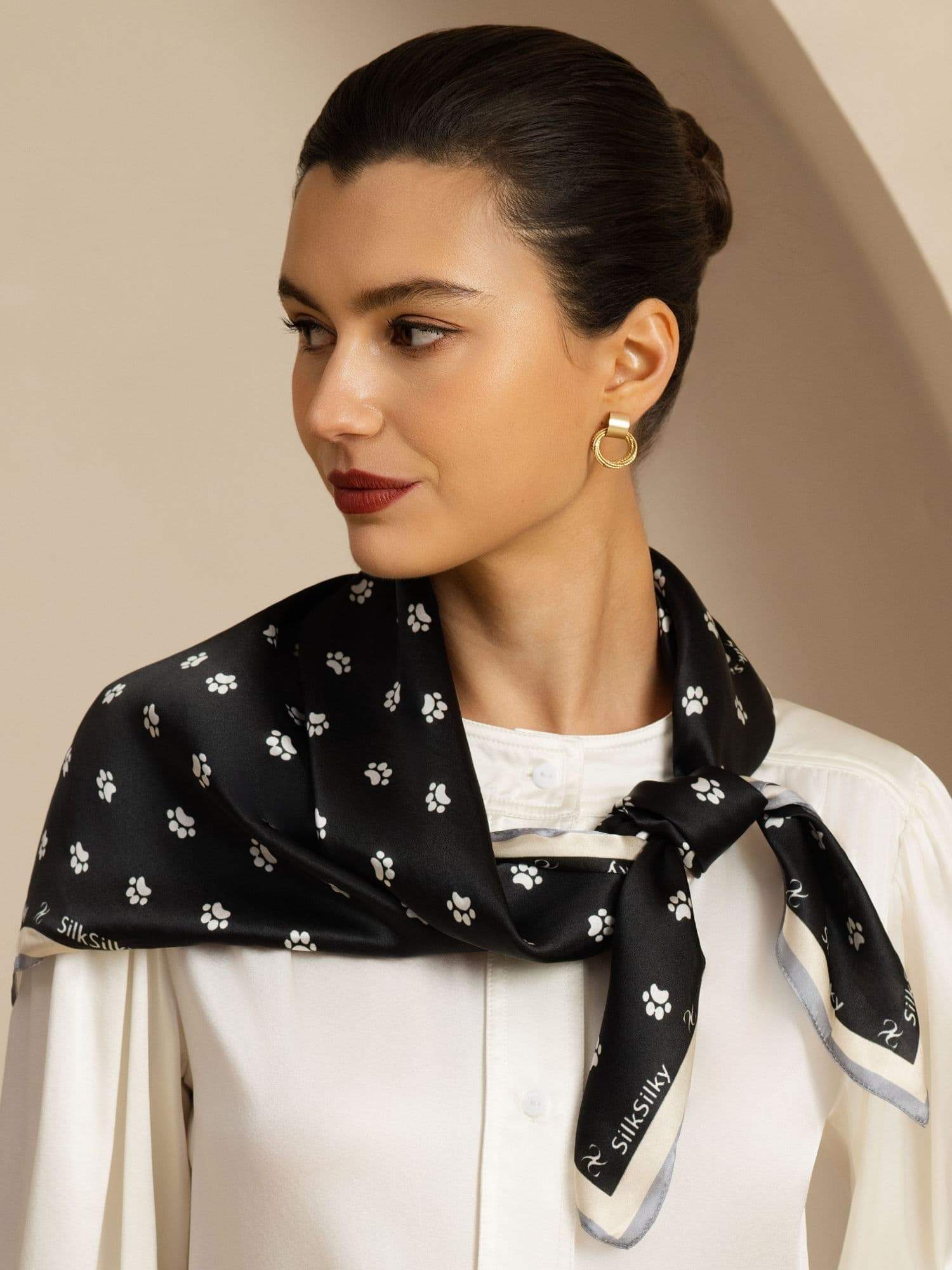 Denna sidenscarf i storlek 90x90 cm är tillverkad av lyxigt siden för en mjuk och lätt känsla. Med ett charmigt tassavtrycksmönster kan den bäras som halsduk, hårband eller väskaccessoar. Dess mångsidiga design och eleganta finish gör den till ett stilfullt tillskott till varje outfit och en omtänksam present för alla tillfällen.