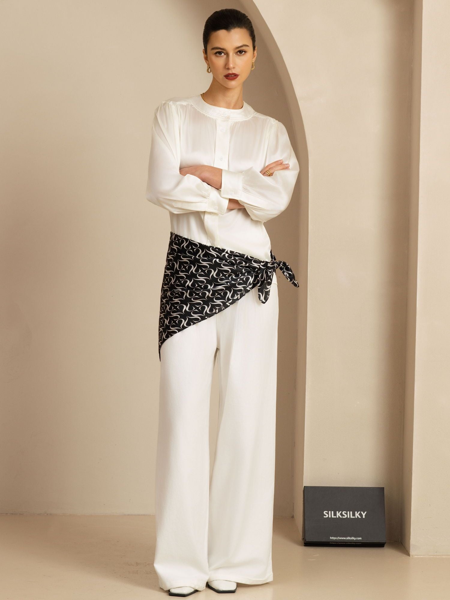 Tillverkad av 100% ren siden erbjuder denna scarf en slät och lyxig känsla med en naturlig glans. Dess mångsidiga design gör att den kan stylas som halsduk, hårband eller accessoar för väskor och bälten. Det klassiska svartvita geometriska mönstret säkerställer tidlös elegans. Perfekt storlek för enkel styling, och den är också en sofistikerad present för alla tillfällen.
