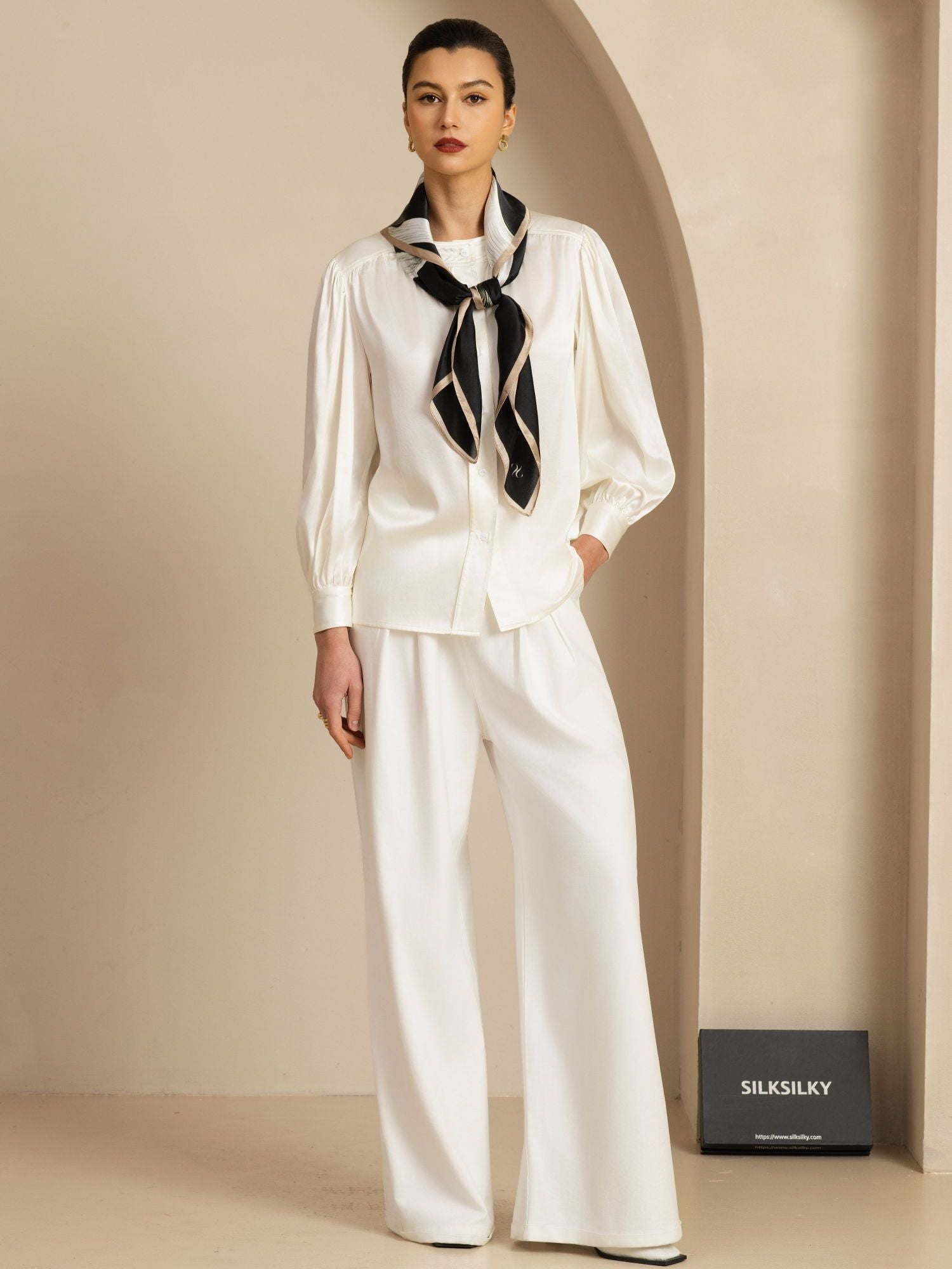 Tillverkad av 100% ren silke har denna scarf en silkeslen textur och en lyxig glans. Den svarta basen är elegant dekorerad med fina vita bandtryck som ger varje outfit en sofistikerad touch. Perfekt för vardagskläder, kontoret eller kvällstillfällen. Denna mångsidiga accessoar kan bäras runt halsen, knytas på en väska eller stylas som huvudscarf. Tillverkad av SilkSilky, känt för premiumsilke och skickligt hantverk, vilket garanterar hållbar kvalitet och tidlös elegans.